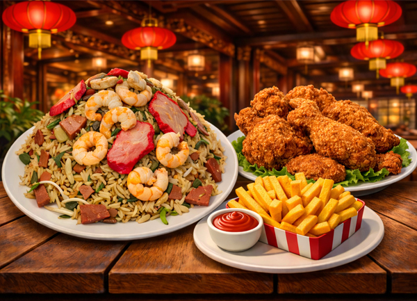 1 pollo broaster, 1 caja a elegir: ( Arroz chino, shopsuey, Chow mein), y papa francesa y salsas